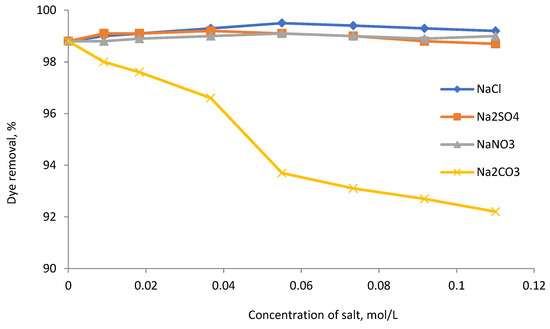 Common inorganic salts, such as chloride, sulphate, carbonate, and nitrate, present in textile effluents may affect dye removal [23,29]. For this reason, the effect of NaCl, Na2SO4, Na2CO3, and NaNO3 on the dye removal of RB5 (100 mg/L), which has a higher dye removal percentage than RO16, was investigated in Figure 8. The addition of NaCl, Na2SO4, and NaNO3 to the solution did not have a significant effect on the removal of RB5 dye. The percentage of dye removal remained constant at high salt concentrations, illustrating the high efficiency of lignin-METAC as a flocculant. However, the removal of RB5 was more influenced by Na2CO3. In this case, the dye removal efficiency decreased from 98.8% to 92.2%. This has also been reported in the removal of azo-dyes using chitosan and is attributed to a charge screening effect and/or change of the double layer surrounding the flocculated molecules [24].
