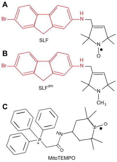 (A) The chemical structure of the spin-labeled fluorene (SLF). The amyloid-targeting domain is shown in red and the nitroxide spin label moiety is shown in black. The diamagnetic form of SLF (SLFdm) that lacks the nitroxyl antioxidant capacity is shown in (B). (C) The structure of the antioxidant MitoTEMPO.