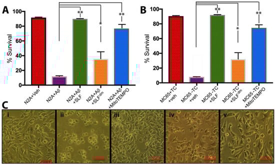 Cytotoxicity in N2a and MC65 cells cultured and treated as described in Section 4.2 was determined using counts of viable cells 72 h after treatment based on the MTT assay (tetrazolium dye MTT 3-(4,5-dimethylthiazol-2-yl)-2,5-diphenyltetrazolium bromide), which was described previously by Maezawa et al., 2007. Both N2a and MC65 cells were plated at a density of 2.5 × 105 cells/well in a 96-well plate in 200 μL in the same medium described in Section 4.2. The Aβ solution was prepared in phenol red-free (OPTIMEM) and fetal bovine serum-free media as described in Section 4.3, then added to the N2a cell cultures at final concentrations of 1 μM for Aβ and 2 μM for SLF, SLFdm, and MitoTEMPO. The MC65 cells were cultured in the same conditions in the presence and absence of TC at 1 μg/mL. The compounds were added to the cultures at 2 μM for SLF, SLFdm, and MitoTEMPO for 9 wells and 3 rows. After 24 h of incubation, 150 μL media was removed and 5.5 μL of 2.5 mg/mL MTT (thyazolyl blue compound) was added to each well to a final concentration of 0.25 mg/mL. After 2 h incubation at 37 °C, 100 μL of solubilization buffer (0.1 N HCL in isopropanol) was added to each well and the plates were placed on a shaker at room temperature until blue crystals are dissolved. The plate was read on the plate reader at 560 nm for MTT and 630 nm for baseline subtraction. Cell viability was expressed as the percentage of viable cells.