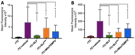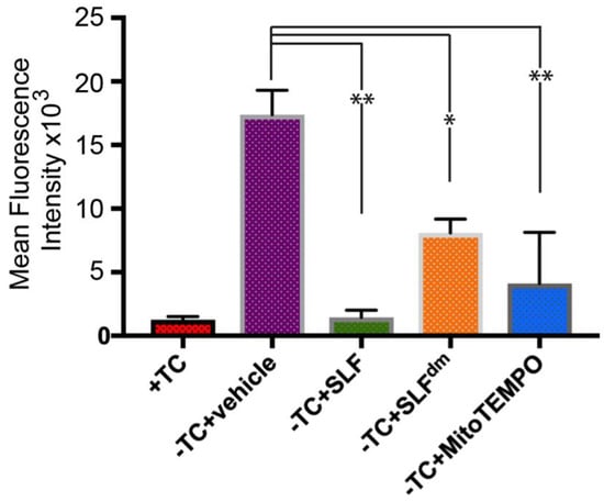 Quantification of mean fluorescence intensity signal of Aβ-induced ROS signal (see Figure 3) in human neuronal cells overexpressing the amyloid precursor protein (APP). The effect on Aβ-induced ROS signal of SLF, SLFdm, and MitoTEMPO addition to the APP-induced cells (−TC) is given by the green, orange, and blue bars, respectively, and is compared to the −TC group. Statistical analyses of fluorescence intensity by one-way ANOVA gives * p < 0.01, ** p < 0.001 for n = 3. Error bars represent the standard error as described in the Methods section.