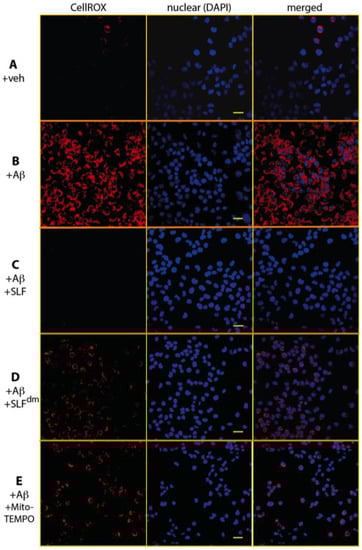 We then probed the distinct functionalities of SLF by separately investigating its effects on Aβ levels and ROS scavenging. First, we used super resolution microscopy to image the intracellular Aβ load in MC65 cells with and without SLF treatment. The FSB-stained cells show a large accumulation of Aβ. This should be evaluated as total Aβ since FSB stains various forms of amyloid assembly. The high-resolution image reveals a clear perinuclear distribution of Aβ with an apparent distortion of the nuclear membrane. The significance of this distribution in the etiology of AD remains to be investigated. When the APP-induced MC65 cells are treated with SLF, the FSB signal is dramatically reduced. This indicates that SLF not only protects against Aβ toxicity but also affects Aβ metabolism within the cell by decreasing amyloidogenic processing and/or increasing Aβ clearance. Our previous studies [20,21,22] showing that SLF converts AβO into smaller, more stable oligomers may provide a thermodynamic explanation for the enhanced peptide clearance. In this regard, further imaging studies directed towards candidate pathways for SLF-enhanced clearance will be very useful.