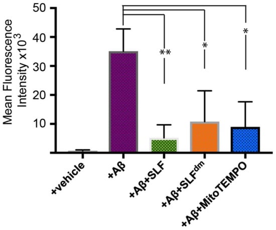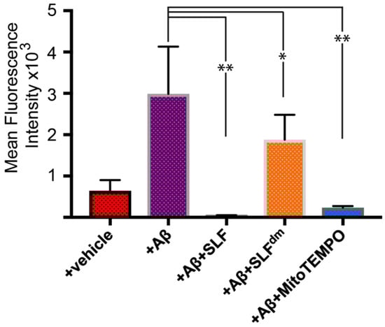 Quantification of mean fluorescence intensity signal from Aβ-induced ROS signal (see Figure 5) in N2a neuronal cells treated with 1 μM exogenous Aβ. The effect of SLF, SLFdm, and MitoTEMPO co-addition on the Aβ-induced ROS signal of Aβ-treated N2a cells is given by the green, orange, and blue bars, respectively, and is compared to the +Aβ group. Statistical analysis of fluorescence intensity by one-way ANOVA gives * p < 0.01, ** p < 0.001, n = 3. Error bars represent the standard error as described in the Methods section.