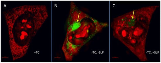 To investigate the specific sub-cellular localization of Aβ deposition and SLF’s role in modulating this process, we cultured MC65 neurons expressing the APP protein without TC for 24 hours in the presence of SLF or vehicle. We assessed Aβ deposits by super-resolution microscopy using the FSB stain, which is a known amyloid dye (Figure 7) [34,35]. Cells grown in the presence of TC served as controls (Figure 7A). In cells overexpressing the APP protein, there is significant FSB staining of accumulated intracellular Aβ (green staining, Figure 7B). The bulk of the deposits surround the nucleus and appear to distort and protrude into the nuclear membrane (Figure 7B). As shown in Figure 7C, there is a greatly reduced FSB signal in cells treated with SLF, which indicates that SLF effectively blocks intracellular Aβ accumulation in cells overexpressing APP.