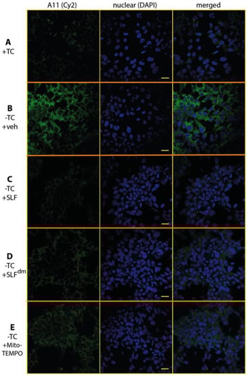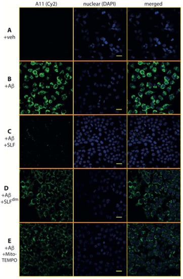 The oligomer-specific antibody A11 provides a powerful tool to detect the presence of Aβ in its toxic, oligomeric state [36,37]. A11 also reacts with oligomeric forms of other amyloidogenic peptides such that it recognizes a conformation specific to pathogenic misfolded proteins. To specifically probe the effect of SLF on oligomeric Aβ (AβO), MC65 neurons overexpressing the APP protein were cultured for 24 hours in the presence of SLF or vehicle, stained with A11 antibody, and examined by confocal microscopy (Figure 8). In the absence of APP induction, no A11 signal is detected (Figure 8A). Upon induction of the Aβ precursor, a clear perinuclear signal for the A11 antibody is evident (green staining, Figure 8B), which shows that much of the accumulated intracellular Aβ is in the oligomeric state. As shown in Figure 8C, SLF treatment of APP-induced MC65 cells effectively removes all A11 staining relative to the non-induced control. SLF lacking its catalytic antioxidant functionality (SLFdm) is less efficient in blocking AβO accumulation (Figure 8D), although it performs better than the nitroxide antioxidant alone (Figure 8E). Quantification of the green fluorescent signal of the anti-AβO antibody from confocal images of cultured cells is shown in Figure 9A. SLF shows a large decrease (about seven-fold) in fluorescence intensity from the anti-AβO antibody versus cells treated with vehicle. SLFdm and MitoTEMPO showed approximately a three-fold decrease and about a five-fold decrease in A11 intensity versus treatment with the vehicle alone, respectively (Figure 9A). The intensity of Aβ staining in APP-induced cells without protective treatment was highly variable, which is indicated by the error bars in Figure 9. This can be attributed to uneven localization and aggregation and trafficking patterns of Aβ within the highly stressed cells.