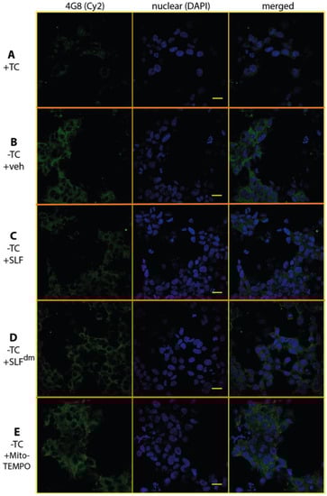 Intracellular Aβ exists as a dynamic mix of soluble oligomers of various sizes with the small intracellular soluble oligomers considered the most toxic form of Aβ [38]. In order to test whether SLF decreases the total Aβ load within the cells, MC65 neurons expressing APP protein were stained with the 4G8 antibody, which recognizes all conformational states of the peptide. Induced (−TC) cells were treated with vehicle or SLF for 24 hours, stained with the 4G8 antibody for total Aβ levels, and imaged by confocal microscopy (Figure 10). As shown in Figure 10C, SLF substantially lowers total Aβ relative to the vehicle control (Figure 10B). Therefore, the ability of SLF to lower AβO levels (Figure 8) can, in part, be attributed to improved cellular clearance of the peptide generated by APP overexpression. Similarly to their effects on AβO levels, SLFdm and MitoTEMPO treatment also lower total Aβ levels, but to a lesser extent than the bifunctional SLF. Quantification of 4G8 intensity (Figure 8, green signal) is shown in Figure 9B. Regarding their effects on total Aβ, SLFdm outperforms MitoTEMPO, which may indicate that antioxidant functionality is more significant in modulating the formation of AβO while the clearance of total Aβ benefits more from the conformational effects caused by the docking moiety of SLF.