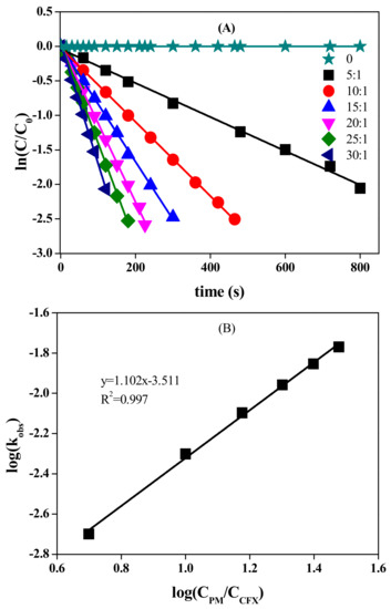 Effect of PM concentration on the oxidation of CFX (A), and log (kobs) vs. log (CPM/CFX) (B). [CFX] = 40 μM, pH 7.0. Note: the ratio is PM/CFX.