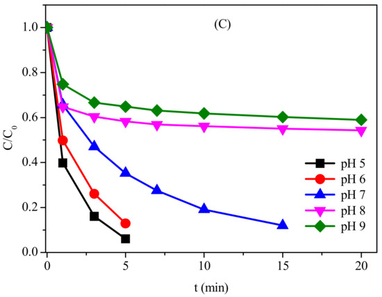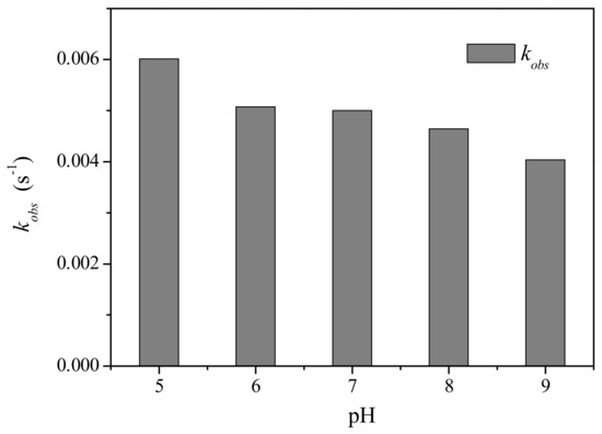 The solution pH has been regarded as an important factor influencing oxidation of various organic contaminants by PM. Hence, the impact of pH was examined for PM-induced oxidation of CFX at pH 5.0–9.0, with the result shown in Figure 2. The oxidation of CFX by PM was pH dependent, and lower pH was favorable for PM-induced oxidation of CFX. Specifically, the kobs of CFX gradually decreased from 0.006 to 0.0041 s−1 when pH increased from 5 to 9. Generally, the redox potential of PM decreased with increasing pH, i.e., acidic pH was favorable for enhancing the oxidation capacity of PM [21]. Hence, the faster oxidation of CFX by PM at lower pH might be attributed to the higher oxidation capacity of PM. This result was consistent with the previous reports that PM-induced oxidation of diclofenac decreased with the elevated pH [22]. However, the oxidative reactivity of PM with some contaminants, e.g., lincomycin and sulfamethoxazole, increased at elevated pH [23,24], whereas the oxidation of dichlorvos by PM was found to be unaffected by the solution pH [25]. Hence, pH impact on PM-induced oxidation of organic contaminants was complicated, which was not only dependent on the oxidation capacity of PM, but also on the structure of target contaminants.