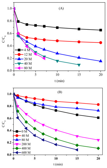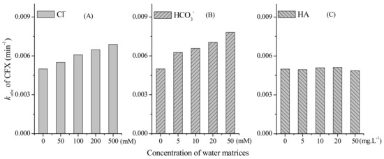 The water matrices, e.g., the inorganic and organic solute, might affect the oxidation of target organic contaminants during PM oxidation. Hence, we further evaluated the effect of common ions, e.g., Cl− and HCO3−, on PM-induced CFX oxidation. As shown in Figure 3A, the calculated kobs of CFX oxidation increased with the increasing concentration of Cl− from 0 to 500 mM. Similarly, the presence of HCO3− promoted the oxidation of CFX by PM, and the rate constants also increased when HCO3− concentrations increased from 0 to 50 mM (Figure 3B). This result was consistent with a previous report that the common ions, e.g., HCO3−, exhibited strong accelerating effect on BPA oxidation by PM, but the mechanism was still ambiguous and need further investigation [27].