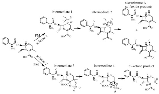 For the sulfoxide products, the thioether sulfur on the six-membered ring of CFX was the reaction site for PM oxidation. Indeed, the thioether sulfur was susceptible to oxidative transformation by various oxidants, e.g., peroxymonosulfate [15], ferrate(VI) [14] and sulfate radicals [32]. The CFX-sulfoxide products were generated by the electrophilic attack of the positively charged Mn atom in PM on the thioether sulfur to form Mn-sulfur intermediate 1. Subsequently, a pair of electrons of sulfur were donated to a d-orbital of Mn, inducing the formation of a coordinate covalent intermediate 2, which were further decomposed to sulfoxide products by rearrangement [33] (Figure 5, scheme 1). For the 379 product, the double bond on the six-membered ring was the reaction site for PM oxidation. The positively charged Mn electrophile attacked the unsaturated C=C bond on the ring, and then forming cyclic hypomanganate(V) ester (intermediate 3) via an activated organometallic complex. Afterwards, the cyclic manganite(VI) ester (intermediate 4) was generated from the cyclic hypomanganate(V) ester by the oxidation of PM, and subsequently hydrolyzed to generate di-ketone-containing product [33] (Figure 5, scheme 2).