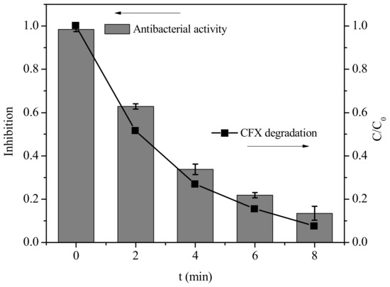 Although PM was effective to oxidize CFX, the β-lactam ring still existed in the transformation products. To investigate whether the products possess biological activity, we further evaluated the antibacterial activity of the transformation products of CFX by PM with E. coli as the tested bacteria. As shown in Figure 6, the growth of E. coli could be completely inhibited in the presence of 40 μM CFX. After addition of PM, the antibacterial activity of CFX solution gradually decreased along with the gradual oxidation of CFX. Specifically, the growth inhibition was reduced to 13% after 8 min when about 92% of initial CFX was oxidatively degraded in the presence of PM. This result indicated that the biological activity of CFX could be significantly reduced after treatment of PM. Various oxidants have been investigated to remove the antibacterial activity of CFX. For example, peroxymonosulfate [15], ozone [34] and ferrate(VI) [14] were found to significantly eliminate the biological activity of CFX. However, the products of β-lactam antibiotics (e.g., AMX) with UV/TiO2 still exhibited significant activity to Enterococcus faecalis (ATCC 14506). The results in this work indicated that PM was effective to eliminate the biological activity of CFX.