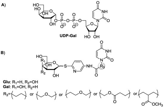 Accepting this assumption, a series of UDP-Gal donor analogues was designed. The designed inhibitors contain components of natural glycosyltransferase donors in their structure: monosaccharide linked through a linker to the acyclic derivative of uridine (Figure 1).