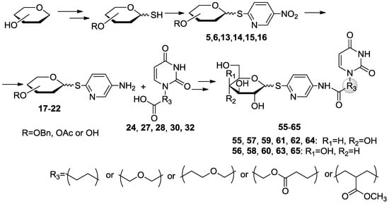 The first step leading to obtaining the assumed glycoconjugate structures is the synthesis of the 1-thiosugar with the α-configuration, which is converted into the 1-thioglycoside by a reaction with the corresponding nitropyridine derivative, followed by a reduction of the nitro group to the amino group. The next stage is the synthesis of acyclic derivatives of uridine containing a carboxyl group in the terminal position. The final glycoconjugates are obtained by condensing the intermediates to form an amide bond and removing protecting groups.
