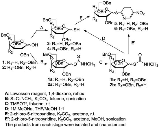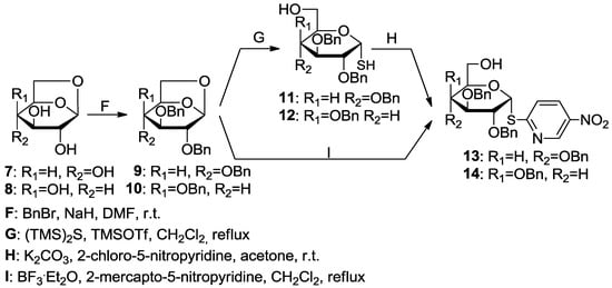3.2.1. Synthesis of (5-nitro-2-pyridyl) 2,3,4-tri-O-benzyl-1-thio-α-d-glycopyranosides 13 and 14