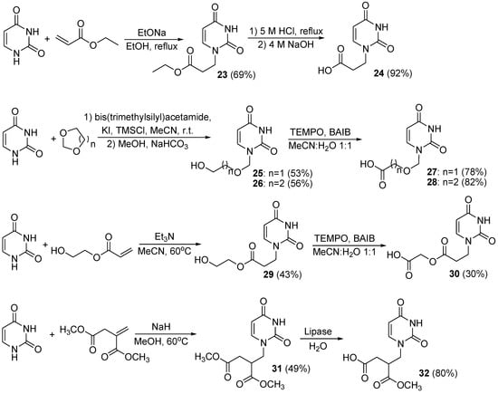 The acyclic derivative of uracil, 3-(2,4-dioxo-3,4-dihydropyrimidin-1(2H)-yl) propanoic acid 24 (Scheme 4) was obtained from 3-(2,4-dioxo-3,4-ethyl dihydropyrimidine-1(2H)-yl) propionate 23 by hydrolysis with 5M HCl at an elevated temperature [50]. Next, [(2,4-2-[(2,4-dioxo-3,4-dihydropyrimidin-1-(2H)-yl) methoxy]acetic acid 27 and 2-[(2,4-dioxo-3,4)-dihydropyrimidine-1-(2H)-yl) methoxy]propanoic acid 28 were obtained. The substrates for their preparation, 1-[(2-hydroxyethoxy)methyl]pyrimidine-2,4 (1H,3H)-dione 25 and 1-[(2-hydroxypropoxy)methyl]pyrimidine-2,4(1H,3H)-dione 26, were synthesised according procedure found in the literature using 1,3-dioxolane or 1,3-dioxane [51]. For the oxidation of compounds 25 and 26, the TEMPO/BAIB oxidation system has been implemented to obtain the desired products [52,53]. This oxidation system proved to be able to give the corresponding carboxylic derivatives 27 and 28 in good yields. The next obtained compound was 2-hydroxyethyl 3-(2,4-dioxo-3,4-dihydropyrimidin-1(2H)-yl)propanoate 29 [54], which was subjected to the oxidation of the terminal hydroxy group by a reaction with the TEMPO/BAIB system in a MeCN:H2O solvent mixture in analogy to the procedure for the preparation of compounds 27 and 28. In this case, ([3-(2,4-dioxo-3,4-dihydropyrimidin-1(2H)-yl)propanoyl] oxyacetic acid 30 was obtained in a moderate yield.