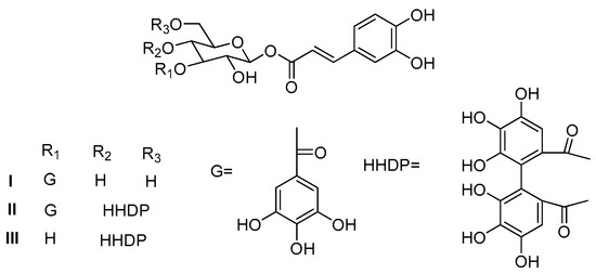 - Jiang, Z.H.; Hirose, Y.; Iwata, H.; Sakamoto, S.; Tanaka, T.; Kouno, I. Caffeoyl, coumaroyl, galloyl, and hexahydroxydiphenoyl glucoses from Balanophora japonica. Chem. Pharm. Bull. 2001, 49, 887–892. [Google Scholar] [CrossRef] [PubMed]