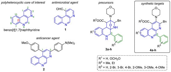 Benzo[f][1,7]naphthyridines [1] (Figure 1) are naturally occurring [2,3] and synthetic benzo-fused bis-heterocyclic systems [4], which have been of high interest for synthetic community from many years ago, mainly due to their interesting properties in various fields of science, such as optics [5]. However, their main application lies in the medicinal chemistry because some bioactive compounds are based on the benzo[f][1,7]naphthyridine core. As representative examples, benzo[f][1,7]naphthyridine-1-carbaldehyde (1, Figure 1) exhibited good MIC values against some pathogenic microbes like Gram negative bacteria (E. coli = 0.2 μg/mL; P. aeruginosa = 0.2 μg/mL; K. pneumoniae = 0.3 μg/mL), Gram positive bacteria (L. monocytogenes = 0.05 μg/mL; S. aureus = 0.1 μg/mL; S. faecium = 0.2 μg/mL) and pathogenic fungus (C. albicans = 0.05 μg/mL) [6]. In the same way, the 1,3-diaryl-benzo[f][1,7]naphthyridine 2 exhibited very interesting cytotoxicity GI50 values against human cell lines (lung: NCIH23 = 1.72 μM, colon: HCT15 = 1.86 μM, gastric: NUGC-3 = 1.95 μM, renal: ACHN = 1.98 μM, prostate: PC-3 = 2.98 μM, and breast: MDA-MB-231 = 2.30 μM), as well as outstanding human topoisomerase IIα inhibitory properties (91.3% at 100 μM) [7]. It is relevant to highlight the influence of the aromatic rings (and their substituents) at C-1 and C-3 positions from the compound 2 to improve the cytotoxicity. The present article describes an improved cascade multicomponent reaction/cycloaddition process to synthesize the oxa-bridged polyheterocycles 3a–h (Figure 1), coupled to a full aromatization process towards the polyheterocyclic compounds 4a–h (Figure 1). Both series are based on the benzo[f][1,7]naphthyridine core, containing an aromatic ring in the C-5 position, keeping in mind their potential application in optics and medicinal chemistry.