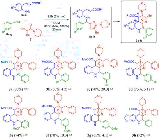 Considering the optimal reaction parameters found previously by us [19], we started the synthesis of the oxa-bridged 5-aryl-benzo[f][1,7]naphthyridines 3a–h, taking the compound 3a as the model to find the new optimal conditions (Scheme 1). Thus, the trifunctional methyl (E)-3-(2-aminophenyl)acrylate (5a), benzaldehyde (6a) and the chain-ring tautomerizable 2-isocyano-1-morpholino-3-phenylpropan-1-one (7) were combined sequentially in PhMe at 60 °C (conventional heating conditions), using 1.0 equiv. of LiBr. However, as expected, the first desired 5-aryl-containing oxa-bridged product 3a could not be synthesized (nor its precursor, the Ugi-adduct 8a). Conversely, various uncharacterized byproducts were detected in low amounts by TLC, including starting reagents and the corresponding Schiff-base. Thus, using again PhMe as solvent at 60 °C, we tested the next BrØnsted and Lewis acids: NH4Cl [24], PTSA [25], AlCl3 [26] or Sc(OTf)3 [27] because it has been reported their use to activate the Schiff-bases involved in Ugi-three component reactions, but all attempts toward 3a were unsuccessful. In the same way, some experiments increasing the temperature over 60 °C were conducted, but decomposition was observed by TLC. Then, MeCN or DCM were used as solvents in combination with all the previously tested additives, but under MW-heating conditions, finding that, at 60 °C (100 W) and using DCM as the solvent and LiBr as the catalyst (0.05 instead 1.0 equiv.), the product 3a was obtained in 85% yield as a mixture of separable diasteroisomers in 6 to 1 ratio, which is in concordance with those previously observed by us when aliphatic aldehydes were used as starting reagents (dr = 3 to 1) [19]. Thus, a 85% yield is considered as excellent based on the molecular complexity of the compound 3a, and that until now, it had not been possible the synthesis or isolation anywhere of any oxa-bridged 5-aryl-containing benzo[f][1,7]naphthyridine. The role of MW-irradiation as heat source to trigger/facilitate [4+2] cycloaddition reactions (thermal pericyclic processes) toward oxa-bridged polyheterocycles is well known [28,29], and hence, it was crucial to decrease considerably the reaction times. Then, by taking the new optimized reaction parameters, we synthesized the compounds 3b–h, but in all cases in lower yields (50–75%) in comparison to the product 3a (85%). The substrate scope was evaluated by synthesizing bromine- and methoxy-containing analogues 3b–g from ortho-, meta- and para-substituted benzaldehydes 6b–g. Additionally, the di-oxa-methylene containing analogue 3h was synthesized in a true good yield (74%). This product contains an ethyl ester moiety instead of methyl ester. Conversely to the model product 3a (85%), the lowest yield was observed for the product 3b (o-Br analogue), probably due to a bulky effect induced by the halogen atom that may hinder the cycloaddition process. In the same way, conversely to the product 3a (a mixture of separable diasteroisomers), the product 3b was obtained as a mixture of inseparable diasteroisomers (same Rf measured by TLC) in a 4 to 3 ratio (see the 1H-NMR spectrum in the Electronic Supplementary Material for further details), may be due also to the bulky effect coming from the o-Br aryl moiety during the cycloaddition process [20] which, in turn, could explain the lower yields with respect to 3a. The same behavior was observed for the oxa-bridged products 3c (dr = 20 to 3), 3d (dr = 5 to 1), 3f (dr = 10 to 3) and 3g (dr = 4 to 1). It is important to mention that, various experiments trying to isolate the Ugi-adducts 8a–h were performed, but, the intramolecular aza Diels-Alder cycloadditions took place immediately at 60 °C giving the oxa-bridged 5-aryl-containing benzo[f][1,7]naphthyridines 3a–h.