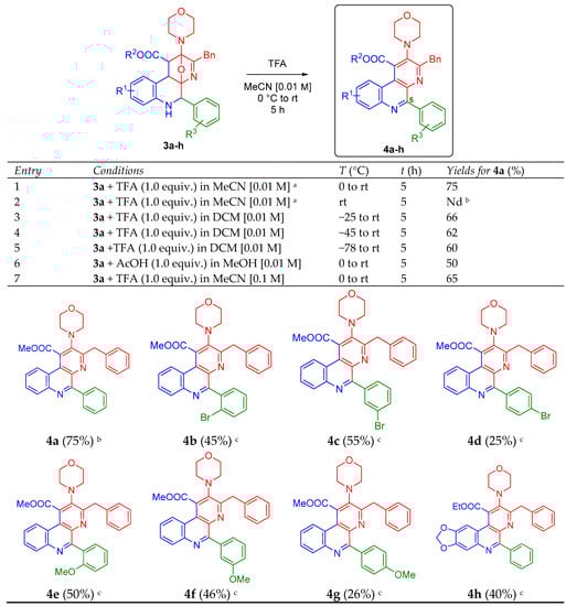 Having in hand the series of oxa-bridged 5-aryl-containing benzo[f][1,7]naphthyridines 3a–h, we went behind the optimal conditions to aromatize the polyheterocyclic system via an acid-catalyzed dehydration/oxidation process toward the 5-aryl-containing benzo[f][1,7]naphthyridines 4a–h, taking the compound 4a as the model for the screening (Scheme 2). Thus, the study initiated considering the optimal reaction parameters reported previously by us [20], and again, as it was expected, the product 4a was synthesized in a good yield (75%), entry 1. Then, we performed the reaction at room temperature trying to increase the yields, but several non-characterized by-products were observed by TLC, entry 2. Contrarily, experiments at colder temperatures (−25, −45 and −78 °C) in DCM were carried out, but no significant changes were observed, entries 3–5. In the same way, a system AcOH/MeOH was used (entry 6), but the TFA (1.0 equiv.) in MeCN [0.01 M] gave us the best results, entry 1. The effect of increasing the concentration was also evaluated [0.1 M], but the yield decreased little, entry 7. Thus, the series of 5-aryl-containing benzo[f][1,7]naphthyridines 4b–h were synthesized using the optimal parameters, but in lower yields (26–55%) with respect to the model product 4a (Scheme 2). As seen, the stereoelectronic nature of the substituents did not affect substantially the efficiency of the aromatization process. There was no a clear trend. In the same way, the yields did not change after 5 h in all cases. All products 4a–h were fully characterized using IR, HRMS, 1H- and 13C-NMR techniques (see the Electronic Supplementary Material for further details). It is important to mention that despite several attempts were conducted to obtain adequate crystals for X-ray analysis of the products 4a–h (or at least for one of their precursors 3a–h), all were unsuccessful.