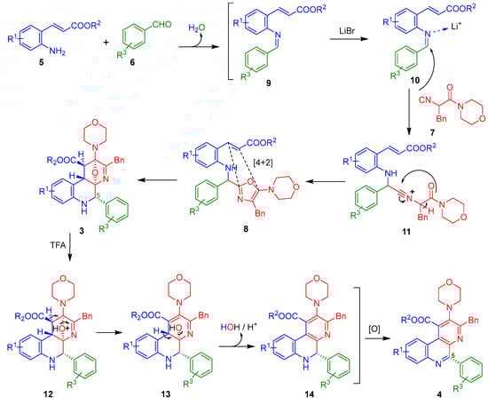 Thus, the amines 5 react with aldehydes 6 to give the Schiff bases 9, which are activated by the Li+ to give the iminium-like ions 10. These latter ones are α-nucleophilically attacked by the isocyanide 7 to afford the nitrilium ions 11, which after a chain-ring tautomerization give the 5-aminooxazoles (Ugi-adducts) 8. Then, the doubly activated dienophile and the aza-diene from 8 undergo an in situ aza-Diels-Alder cycloaddition to afford the isolated oxa-bridged 5-aryl-containing benzo[f][1,7]naphthyridines 3, which after an addition of TFA, give the full aromatic 5-aryl-containing benzo[f][1,7]naphthyridines 4 via a dehydration of their precursors 13 followed by a spontaneous oxidation of 14, both processes triggered by the acidic media (Scheme 3).