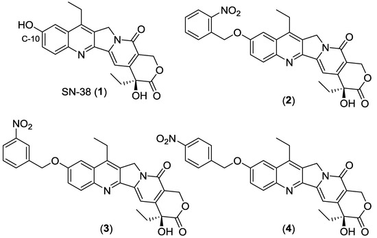 1H and 13C nuclear magnetic resonance (NMR) spectra were recorded on a Bruker 400 MHz spectrometer, Billerica, MA, USA (400 and 101 MHz, respectively) using DMSO-d6 (Merck KGaA, Darmstadt, Germany) as solvent with tetramethylsilane (TMS) as an internal standard. Liquid chromatography-mass spectrometry (LC-MS) analyses were performed on a Shimadzu LC-MS spectrometer, Kyoto, Japan. SN-38 (7-ethyl-10-hydroxylcamptothecin, purity 95%+) was purchased from Ark Pharm, Inc., Arlington Heights, IL, USA. 1,8-Diazabicyclo[5.4.0]undec-7-ene (DBU); 2-, 3- and 4-nitrobenzyl bromides were purchased from Sigma-Aldrich, St. Louis, MO, USA. Organic solvents were ordered from BDH, VWR Analytical unless specified otherwise. All chemicals were used without further purification unless otherwise indicated.