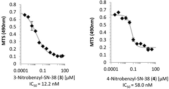 The three nitrobenzyl derivatives (2, 3, 4) and SN-38 were evaluated on their ability to attenuate cell growth using human leukemia K562 cells. Cells harvested during exponential growth were seeded with approximately 1150 cells per well in 96-well microtiter plates. The potential prodrugs were dissolved in dimethyl sulfoxide (DMSO) and tested with 11 different concentrations to construct a dose-response curve, with a final volume of 200 µL per well. Each analog was tested using two adjacent lanes of wells, with the final concentration not exceeding 0.5% (v/v) of DMSO, and an amount of drug that possessed no detectable effect on K562 cell growth. The cells were incubated for 48 h and assayed using standard MTS conditions. The values for the half maximal inhibitory concentration (IC50) were calculated by fitting the average absorbance-concentration data of two lanes to a four-parameter logistic equation. The curves for each compound (1–4) can be found in Figure 2, with the IC50’s of SN-38, and 2-nitro, 3-nitro and 4-nitrobenzyl found to be 3.0, 25.9, 12.2 and 58 nM, respectively. As expected, all nitrobenzyl analogs were found to be less toxic to human K562 cells than SN-38 with a magnitude of approximately 8-, 4- and 19-fold, respectively.