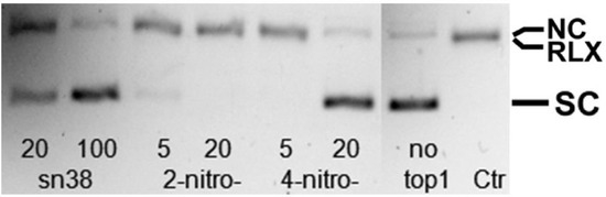 Effects of SN-38 (1), 2-nitrobenzyl-SN-38 (2) and 4-nitrobenzyl-SN-38 (4) on their ability to inhibit the topoisomerase I-induced relaxation of pBR322 DNA. NC, nicked circular DNA; RLX, relaxed DNA; SC, supercoiled DNA; “sn38”, “2-nitro-” and “4-nitro-” denote the tested drugs SN-38 (1), 2-nitrobenzyl-SN-38 (2) and 4-nitrobenzyl-SN-38 (4), respectively; numbers indicate the final concentration [µM] of the tested drug in the assay mixture applied to the lanes above; all lanes except the lane “no top1” contained topoisomerase 1; no drug was added to the lane “Ctr”.