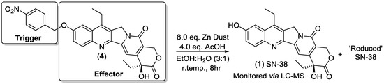 Chemical reduction of 4-nitro-prodrug and release of SN-38 and the formation of a reduced form of SN-38 by zinc dust and acetic acid (monitored via LC-MS).