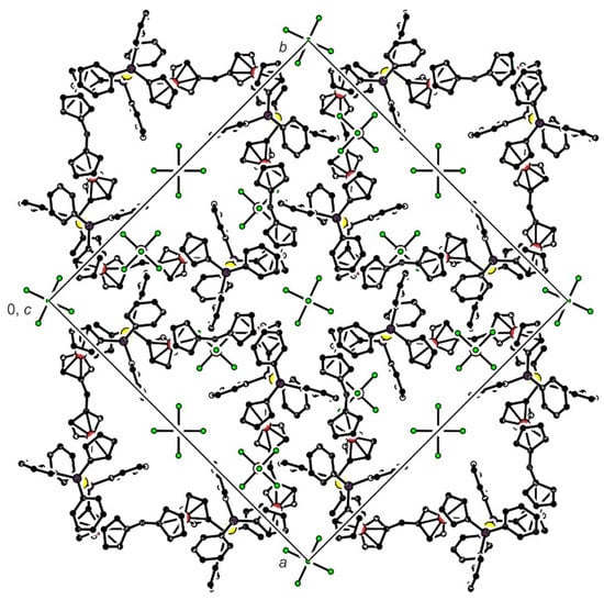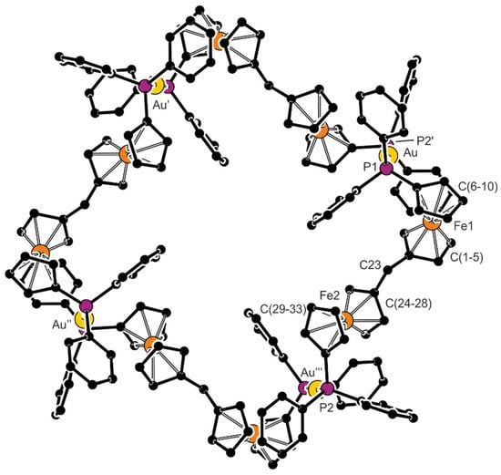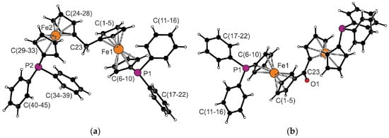 Recrystallization of complex 4 from chloroform-hexane provided crystals of the stoichiometric solvate 4·CHCl3, which was structurally characterized by X-ray diffraction analysis. A view of the complex molecule is shown in Figure 2, and the selected geometric parameters are listed in Table 2. The molecule has near-mirror symmetry; however, this is not reflected in the symmetry of the crystal assembly (i.e., the halves of the complex molecule are crystallographically independent but structurally virtually identical) [29]. In such an arrangement, the diphenylphosphino substituents are located on the same side of the diferrocenylmethane scaffold, forming a pocket that accommodates the central atom. The ferrocene units contribute to the lateral placement of the phosphine substituent, adopting a 1,2 or synclinal eclipsed configuration (ideal value: τ = 72° [30]).