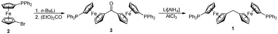 Diphosphine 1 was prepared in two steps from 1′-(diphenylphosphino)-1-bromoferrocene (compound 2 in Scheme 2). This bromide was lithiated with n-butyllithium and the resulting lithio intermediate immediately reacted with diethyl carbonate to give symmetrical ketone 3 in an 88% isolated yield [15,16]. Upon treating with Li[AlH4]/AlCl3 in tetrahydrofuran [17], this ketone smoothly deoxygenated, thereby producing the target compound 1 as an air-stable, orange solid in a 71% yield, following chromatographic purification and crystallization from hot heptane.