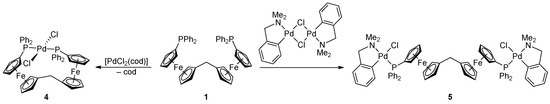 The coordination of the phosphine moieties in Pd(II) complexes 4 and 5 was indicated by shifts of their 31P-NMR resonances to a lower field. For instance, complex 4 displayed a singlet at δP 16.0, which is similar to that of the non-chelate analog trans-[PdCl2(FcPPh2-κP)2] (Fc = ferrocenyl; δP 15.8) [25]. In addition, the 13C-NMR signals of the 31P-coupled carbons (i.e., carbons of the phosphinylated cyclopentadienyl and phenyl rings) were observed as characteristic triplets resulting from virtual coupling in the AXX′ spin system 13C-31P-M-31P-12C (M = Pd) [26]. Such a feature is typical of transition metal bis-phosphine complexes. Conversely, compound 5 gave rise to a singlet 31P-NMR resonance at δP 33.0, which corresponds to the position of the signals of [(LNC)PdCl(Ph2PfcY-κP)2] (fc = ferrocene-1,1′-diyl, Y = CH2(2-pyridyl): δP 33.1 in CD2Cl2 [27], Y = CH2OMe: δP 33.0 in CDCl3 [28]) and demonstrates the equivalence of the chemically identical parts of this complex.