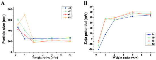 Particle size (A) and zeta-potential (B) of polymer/DNA polyplexes obtained at various w/w ratios by DLS. Data are represented by mean ± standard deviation (S.D.) (n = 3).