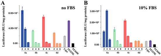 Proper particle size and positive surface charge are essential for efficient gene delivery. It was reported that complexes within the size range of 50 to several hundred nanometers would receive easier endocytosis [44]. Dynamic light scattering (DLS) measurements showed that the particle sizes of 4/DNA polyplexes changed dramatically at relatively low w/w ratios (0.5–1), and became constant at 180~300 nm with the increase of w/w ratio (Figure 2A). The larger particles formed at the w/w ratio of 0.5–1 might be attributed to their neutral zeta-potential, which led to the minimized repulsion and resulting aggregation. Meanwhile, we also examined the possible changes of particle sizes of 4a/DNA at a w/w ratio of 2 in the presence of 10% serum. Results suggested that the particle sizes of polyplexes were still stable at ~250 nm and seldom altered, indicating that no apparent aggregation occurred (Figure S1, Supplementary Materials). Zeta potential shown in Figure 2B indicated the surface charge rose along with the increase of w/w ratios, and reached about +35~50 mV above a w/w ratio of 2. Interestingly, the polyplexes with electron-donating substitute revealed lower zeta potential than the electron-withdrawing ones, which might be due to the positive charge screening by the electron-rich effect. Generally, the positively charged complexes can interact with the negatively charged cellular membranes, leading to more efficient cellular uptake [40].