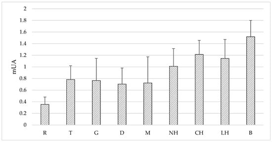 Color intensity of tested honey samples expressed as mAU. Honey variety: R-rape, T-tilia, G-goldenrod, D-dandelion, M-multifloral, NH-nectar-honeydew, CH-coniferous honeydew, LH-leafy honeydew, B-buckwheat. Significant differences (p < 0.05): B-R, B-T, B-G, B-D, B-M, R-T, R-NH, R-CH, R-LH.