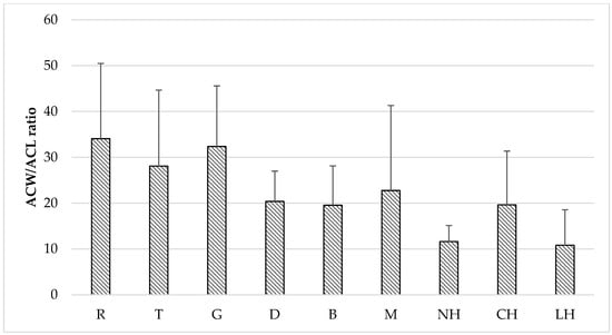 The ratio of antioxidant capacity of hydrophilic to hydrophobic fraction (ACW/ACL) for varietal honey samples determined by PCL assay. Honey variety: R-rape, T-tilia, G-goldenrod, D-dandelion, B-buckwheat, M-multifloral, NH-nectar-honeydew, CH-coniferous honeydew, LH-leafy honeydew