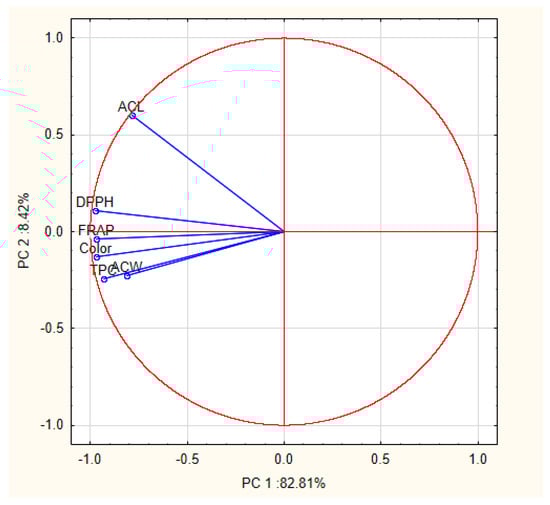 PCA was used in several studies to classify different variety of honey as well as to analyze similarities between samples from different floral origins based on chemical composition, physicochemical and antioxidant properties [16,46,47,48,49]. The obtained results confirmed the significant influence of the botanical origin of honey and their chemical composition and other studied parameters. In this work, we focused on evaluation of the differences among honey samples with reference to the antioxidant activity. The classification based on the antioxidants soluble in water and lipids was carried out for the first time. Additionally to antioxidant parameters, color intensity exhibiting strong positive correlation with them (Table 2) was also included during PCA analysis. High correlation between color intensity and antioxidant activity was previously confirmed [7,21,44]. Due to the large number of samples, the average results obtained for each variety of honey were used. Six variables (FRAP, DPPH, TPC, PCL-ACW, PCL-ACL and color) was reduced to the two principal components (PCs). These components accounted for 91.2% of total variance in the analyzed honey samples (PC1 explained 82.81% of variance and PC2 8.42%). According to the loading matrix shown in Table 3, PC1 was strongly negatively correlated with all tested parameters, while PC2 was positively correlated with ACL. This parameter was the most relevant variable for the discrimination of the samples observed on PCA (force 0.98).
