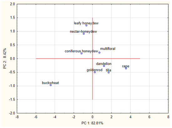 Plot of the PC1 vs. PC2 for classification of studied honey varieties.