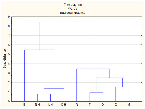 Cluster analysis tree diagram. Honey variety: R-rape, T-tilia, G-goldenrod, D-dandelion, B-buckwheat, M-multifloral, NH-nectar-honeydew, CH-coniferous honeydew, LH-leafy honeydew