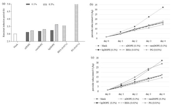 In this work, the ability of DOPEs to decrease lipid peroxidation of cold-pressed safflower oil was investigated by two accelerated oxidation approaches: the Rancimat method at 110 °C (Figure 1a) and the Shall oven test at 65 °C. (Figure 1b,c). In the Rancimat test, we tested the effect of the addition of DOPEs to oils at two concentration levels (0.1% and 0.3%) and the induction period was compared to the blank (pure safflower oil with no added antioxidants) and commonly used synthetic antioxidants (BHA and propyl-gallate (PG)).