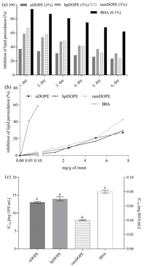 In this work, the efficiency of DOPEs as antioxidants in meats was assessed in minced meat by applying two approaches: stability testing during storage (Figure 2a) and accelerated stability testing and comparison to the activity of BHA (Figure 2b,c).