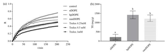 Figure 3a presents β-carotene absorbance inhibition ratios during 120 min incubation in emulsion without added antioxidant (control), emulsions containing DOPEs, and emulsions containing different Trolox concentrations. Obtained data were used for development of Trolox calibration curve and obtained results were then expressed as mg/g of Trolox equivalents (Figure 2b).