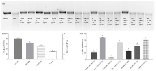 Inhibition of plasmid DNA strand scission and antioxidant activity of DOPE in liposome membrane model. (a): supercoiled (native) form of plasmid pBR322 DNA in electrophoresis gel after incubation with AAPH with or without the presence of antioxidants; (b): antioxidant activity against antioxidant activity against plasmid DNA strand scission expressed as IC50; (c): antioxidant activity of DOPE in liposome membrane model system. nDOPE-native dry olive pomace extract; hpDOPE-extract prepared with hydroxypropyl-β-cyclodextrin; ramDOPE-extract prepared with randomly methylated β-cyclodextrin; BHA: butylhydroxyanisol; IC50: half maximal inhibitory concentration; TBARS: thiobarbituric acid reactive substances. Different letters above data bars indicate significant difference (p ≤ 0.05).