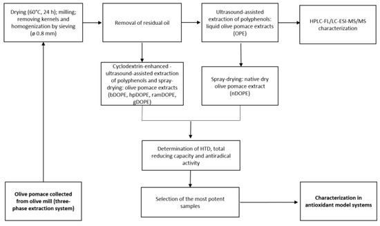 Flowchart of the experimental design (preparation of extracts and analyses). HTD-hydroxytyrosol derivatives; nDOPE: native dry olive pomace extract; hpDOPE: extract prepared with hydroxypropyl-βcyclodextrin; ramDOPE-extract prepared with randomly methylated βcyclodextrin; bDOPE: extract prepared with βcyclodextrin; gDOPE: extract prepared with γ-cyclodextrin.