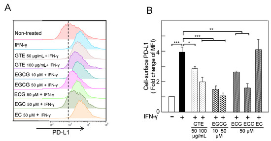 Inhibition of interferon (IFN)-γ–induced cell-surface programmed cell death ligand 1 (PD-L1) protein by green tea extract (GTE) and green tea catechins in A549 cells. (A) Cell-surface PD-L1, and (B) average of fold change of median fluorescence intensity (MFI). “−“ and “+” indicate in the absence or presence of IFN-γ (10 ng/mL). * p < 0.05, ** p < 0.01, *** p < 0.001. EGCG, (−)-epigallocatechin gallate; ECG, (−)-epicatechin gallate; EGC, (−)-epigallocatechin; EC, (−)-epicatechin.