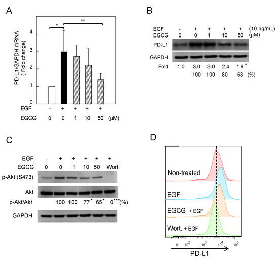 Activation of EGFR signaling by EGF and EGFR mutations also drove PD-L1 expression in NSCLC cells [16,18]. Treatment with 10 ng/mL EGF significantly increased PD-L1 mRNA and protein expression 5.8-fold and 8.9-fold, respectively, and cell-surface PD-L1 about 2.7-fold in Lu99 cells (Supplementary Figure S1). Pretreatment with 50 µM EGCG for 3 h decreased the levels of PD-L1 mRNA and protein in Lu99 cells by 50% and 37%, respectively (Figure 3A,B). It is important to note that EGCG inhibited the EGFR signaling pathway. Pretreatment with 50 µM EGCG decreased p-Akt by 35%, and pretreatment with 1 µM wortmannin reduced p-Akt and cell-surface PD-L1 levels more than EGCG did (Figure 3C,D). Although the effects of EGCG on the EGFR/Akt axis and cell-surface PD-L1 were not strong, EGCG inhibited the production of EGF-induced PD-L1. Overall, EGCG inhibited PD-L1 expression in NSCLC cells induced by two different factors via their specific receptors.
