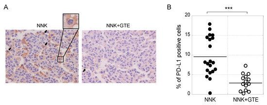 Oral administration of GTE reduced PD-L1–positive cells and inhibited tumor development in the lungs of NNK-treated A/J mice. (A) Representative immunohistochemical staining with anti–PD-L1 antibody. Black arrows indicate PD-L1–positive cells on the plasma membrane. (B) Average percentage of PD-L1–positive cells in individual tumors. *** p < 0.001.