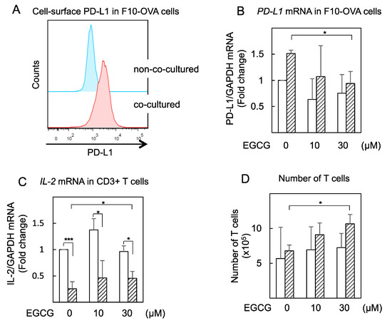 EGCG reduced PD-L1 mRNA expression in co-cultured F10-OVA cells and restored IL-2 mRNA expression in co-cultured tumor-specific CD3+ T cells. (A) Cell-surface PD-L1 and (B) PD-L1 mRNA in F10-OVA cells alone (open bars) and cells co-cultured with CD3+ T cells (shaded bars). mRNA expression normalized by GAPDH in nontreated cells is expressed as 1 in (B) and (C). (C) IL-2 mRNA in CD3+ T cells alone (open bars) and cells co-cultured with F10-OVA cells (shaded bars). (D) Number of T cells in CD3+ T cells alone (open bars) and cells co-cultured with F10-OVA cells (shaded bars) were counted by trypan blue exclusion method. * p < 0.05, *** p < 0.001.