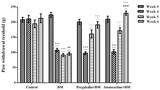 Paw withdrawal thresholds of normoglycemic rats administrated physiological saline (Control), and of diabetic rats administrated daily 10 mg/kg pregabalin (Pregabalin + DM) and daily 3 mg/kg atomoxetine (Atomoxetine + DM), in the Randall-Selitto test. Values are given as mean ± S.E.M. Within the groups: significant difference against Week 0, Week 4 and Week 5 groups are *** p < 0.001; c p < 0.001 and &&& p < 0.001, respectively. Between the groups: significant difference against Week 4 control, Week 5 control, Week 6 control, Week 5 DM and Week 6 DM groups are xxx p < 0.001; +++ p < 0.001, ééé p < 0.001, ^^^ p < 0.001 and <<< p < 0.001, respectively. Two-way repeated ANOVA, post hoc Bonferroni test, n = 8.
