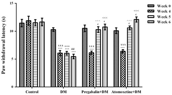 Paw withdrawal latency of normoglycemic rats administrated physiological saline (Control), and of diabetic rats administrated daily 10 mg/kg pregabalin (Pregabalin + DM) and daily 3 mg/kg atomoxetine (Atomoxetine + DM), in the in the Hargreaves test. Values are given as mean ± S.E.M. Within the groups: significant difference against Week 0 and Week 4 groups are *** p < 0.001 and c p < 0.001, respectively. Between the groups: significant difference against Week 4 control, Week 5 control, Week 6 control, Week 5 DM and Week 6 DM groups are xxx p < 0.001; +++ p < 0.001, ééé p < 0.001, ^^^ p < 0.001 and <<< p < 0.001, respectively. Two-way repeated ANOVA, post hoc Bonferroni test, n = 8.