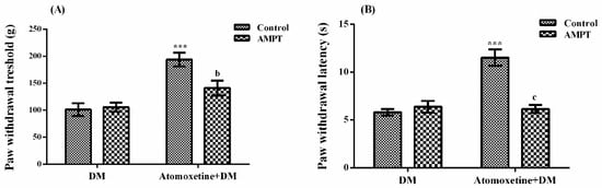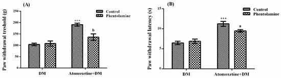 Based on the curative activity potentials of monoamine reuptake inhibitory drugs on neuropathic pain [8,9,10,11,12,13], promising therapeutic efficacy of atomoxetine, a selective noradrenaline reuptake inhibitor drug, on diabetes-induced hyperalgesia was investigated, in the present study.