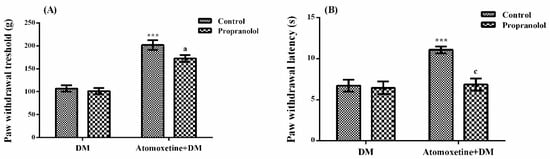 Effects of propranolol pre-treatments on the antihyperalgesic responses induced by atomoxetine (3 mg/kg, 14 days) against mechanical (A) and thermal (B) nociceptive stimuli applied in the Randall-Selitto and Hargreaves tests, respectively. Values are given as mean ± S.E.M. Significant difference against physiological saline administrated diabetic group (DM) is *** p < 0.001; Significant difference against atomoxetine administrated diabetic groups (Atomoxetine + DM) are a p < 0.05 and c p < 0.001. Two-way repeated ANOVA, post hoc Bonferroni test, n = 8.